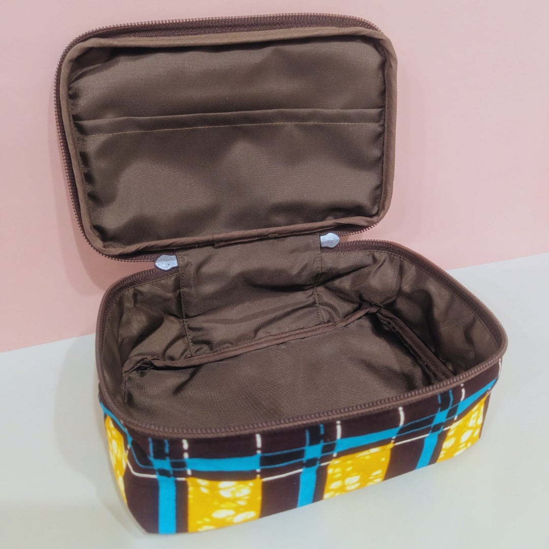 内側まで丁寧に仕上げており、開けるたびに気分が上がるデザイン。持ち手付きなので持ち運びもしやすく、バッグインバッグとしても便利です。中にポケット付き、内側はナイロン裏地で汚れにも強くしっかりした作りです。